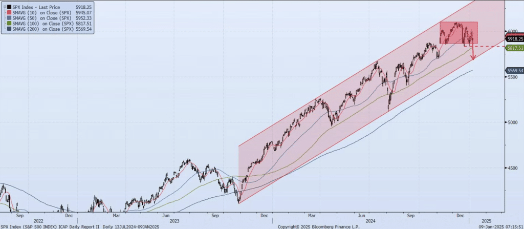 The SPX Index was +16bps on the session yesterday, closing at 5918. The session was a total “chop fest” with multiple 30+ point swings. The low of 5874 broke the previous day’s low (ref 5890) as momentum and trend remain negative to flat. Spot VIX hit a high of 19.50 matching the Jan 2 high. This, based on a VIX spike signal I follow, kept volatility contained. Watch for a break in VIX above 19.50 as a signal that the SPX Index downside velocity is ready to spike. I watch but rarely mention, the 10-year yield was at 4.68%. This is clearly a bad signal for the SPX Index. The ICAP Momentum/Trend (MOTR) Model signal remains in a Negative position. I continue to see risk skewed to the downside under the current set up. The consolidation we are forming is more a reversal than a continuation pattern in my opinion. The Nov 5/Nov 6 gap still needs to be filled and would suggest a near-term downside target of 5700. Additionally, I fully expect a 10% peak-to-trough move in the intermediate term, suggesting a downside target of 5500.
