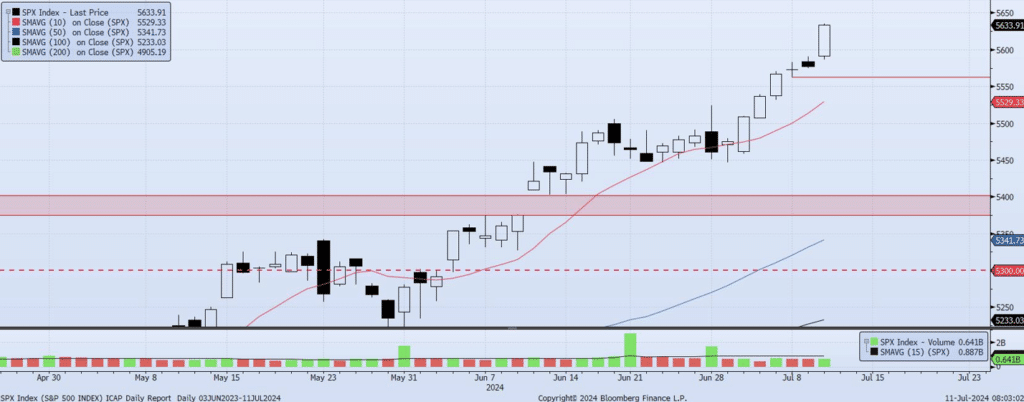 There is no question, over the past two weeks I have been cautious and have stated quite often that I see risk increasingly skewed to the downside. My momentum/trend model (MOTR) overall has shown significant negative divergence. What’s also concerning is that the SPX continues to grind higher with historically low breadth and below average volume. Additionally, the index has had just one peak-to-trough pullback of 5% YTD (again, historically low downside volatility). As the signals and evidence continue to create reasons to reduce long exposure and become even more cautious pure price action and trend can’t be denied. During yesterday’s session, the SPX hit its 37th all-time high for the year achieving and breaking above the previously identified resistance level of 5600. The MOTR signal has shifted from negative to neutral with yesterday’s action as I now see risk balanced at current levels. I would be strategically long here to take advantage of potential upside while understanding that the likelihood of a reversal is still much higher than most market participants are expressing. As a level, a break below the doji low on Jul 8 (ref 5562) would be extremely negative and create the potential for a deeper move lower.