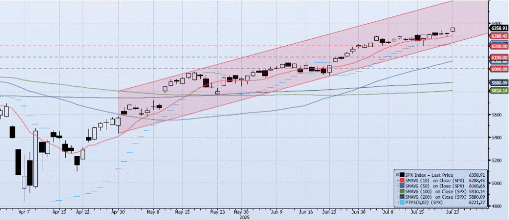 The SPX index gained 78bps on the day, closing at a new all-time high of 6358. The index was strong for the entire session as momentum and trend recovered slightly. My Spot VIX signal is “neutral”. My VIX Term Structure signal is “risk on”. The ACAP Momentum/Trend Model signal is Negative. As I have written over the past few weeks, the clear negative divergence and ACAP signal shifts suggest that risk is skewed to the downside. That’s said, I did write yesterday that “the index is screaming for a reason to test 6400 for the first time in history. I am sticking to the ACAP model and am positioned short here, but I have pared down exposure as this signal is not as clear as I would like.”