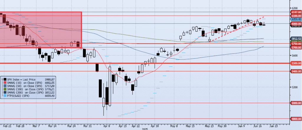 The SPX index lost a modest 3bps yesterday, closing at 5980. This close came at the lower end of the day’s broader, 1% high/low range of 6018/5971. The 6000 level has now failed to hold as support for three of the last four sessions as momentum and trend fade. My Spot VIX signal remains “risk on” but my VIX Term structure signal is “neutral”. The ACAP Momentum/Trend Model signal remains Negative. My overall opinion has not changed. As I wrote yesterday, “near-term risk remains skewed to the downside with 5750 a very reasonable target.”