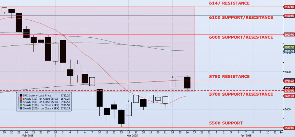 The SPX index lost 1.10% on the session, closing at 5712. I had noted that the Mar 25 stick created a doji, representing “indecision/pause as the index begins to encounter more significant resistance from 5750 up to 5900.” Price action yesterday did reverse off that “indecision”, hitting an intraday low of 5694, essentially testing support at the base of the topping pattern at 5700. The 5700 level needs to hold, or I would expect a relatively aggressive slide back to 5500. Momentum and trend are flat. Spot VIX remains “risk on” while VIX Term Structure is neutral. The ICAP Momentum/Trend (MOTR) Model signal remains Positive. All said, I do not like the long trade here. I continue to believe that the greater risk overall remains skewed to the downside.