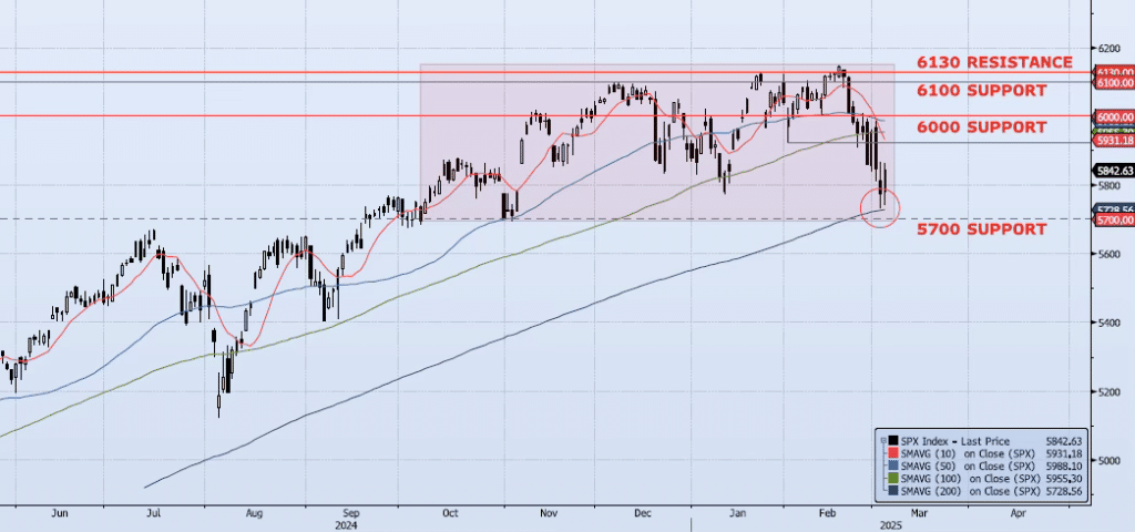 The SPX Index rallied 1.12% during yesterday’s session, closing at 5842. Nothing unexpected as the 200dma (ref 5728) and 5700 acted as support after an over 6% selloff in just 9 sessions. Momentum and trend indicators remain negative. However, my Spot VIX signal hit a Buy on the close today. This is important. This is a secondary signal which I developed and use alongside MOTR to manage the ICAP portfolio and should be given some weight. The ICAP Momentum/Trend (MOTR) Model signal remains Negative. As I wrote yesterday morning, “The test of 5700 will be key as a break there could lead to a test of additional downside targets at 5500 and 5000. In short, I have taken down most of my short SPX/long VIX exposure but will continue to be a seller of any bounce (or break) moving forward.” My view and strategic stance have not changed. However, I will be more patient in reinstating the SPX short as I expect the current counter trend rally to have some legs. That said, I continue to believe that the index is topping. This is a process and will involve massive spikes in price volatility in both directions ultimately leading to a breakdown below 5700.
