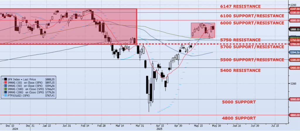 The SPX index fell 56bps during yesterday’s session, closing at 5888. The index remains within the highlighted support/resistance range of 5786/5968. Although my momentum and trend indicators are flat to down, the index is holding up much better than anticipated. The May 23 hard bounce off the 100dma and 200dma was impressive and much more aggressive than I expected. My Spot VIX signal is now “risk on”. My VIX term structure signal is neutral. The ACAP Momentum/Trend Model signal remains Neutral. As I wrote yesterday, “I see risk as very evenly distributed and am waiting patiently for the next ACAP signal to trigger.” I would note that although I now view the index and trades as “normalized”, I remain conscious of the fact that we are still in a high volatility regime with technical damage remaining from the recent Feb/Apr sell-off.