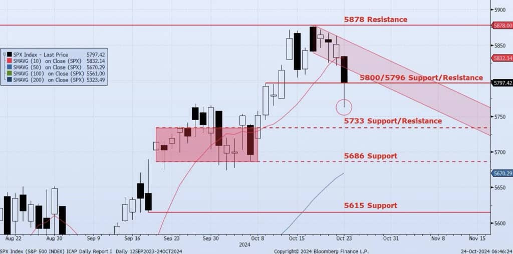 The SPX Index faded (as expected) yesterday, losing almost 1% on the day, closing at 5797. The low on the session was 5762 as price broke down below the highlighted downtrend channel (see chart). Previously identified support at the 10dma (ref 5832) and 5796/5800 were also broken. The next identified support level at 5733 was not tested as the Index held ~30 handles above and reversed into the close. I would note that on Oct 21 I wrote that “Although the Index gained 85bps for the week while marking some new all-time highs, resistance at 5878 continues to hold. This is concerning and as I stated last week, the Index feels “toppy”” and that “I am reducing long exposure”. On Oct 22 I wrote that “the longer the Index churns at current levels the more likely it is that we fade back towards support at 5800 in the near term”. In yesterday’s note I wrote “I would not be surprised if there was a derisking of assets heading into the election”. With yesterday’s fade, the ICAP Momentum/Trend (MOTR) Model shifted from Neutral to Negative as price and internals got crushed. The Index did manage to close back in the 5796/5800 range and futures are up an additional ~40bps in the overnight. I continue to see risk skewed to the downside. Follow through over today and tomorrow will be key.