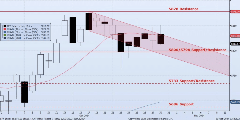 The SPX Index broke above the upper band of the current downtrend channel (see chart), briefly hitting its head at 5850, then reversing to close near the lows (back within the channel) at 5813 (down 33bps). I have been writing over the past week that risk is skewed to the downside. On Oct 29 I wrote that “I do believe that we will see one final push out ahead of next Tuesday. My gut is that there will be a final move to derisk, trim and hedge long exposure. I expect 5800 to break and 5733 to be tested before we start filling in ballots on Nov 5”. Although I have received a ton of push back, I have not changed my opinion. The ICAP Momentum/Trend (MOTR) Model remains Negative. Risk remains skewed to the downside. I expect 5800 to be tested and to break leading to an aggressive move down to 5733.