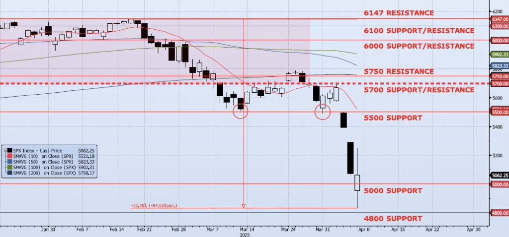 The SPX index ended the session yesterday down a modest 23bps, closing at 5062. Despite how benign that seems, the index had a wild high/low range of 5246/4835 representing an over 8% spread. Absolutely manic price action as the index hit a new peak-to-trough low of 21.35% for the entire drawdown thus far. Momentum and trend degraded further as spot VIX hit a high of 60.13, just shy of the Aug 5, 2024, peak of 65.73. The ICAP Momentum/Trend (MOTR) Model signal remains Negative. The early session drop to 4835 broke the previously identified support level and downside target of 5000 and essentially tested the next support level at 4800. The 5062 close was 4.70% above the session low creating a potential setup for additional upside over the coming days. I would mark the potential upside for any counter trend rally at the 5200/5400 range. I would be a seller of any such rally, not a buyer. I continue to believe this bear market is evolving, not ending, with additional downside to come.