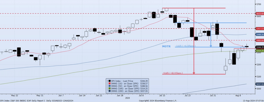 My Momentum/Trend Model (MOTR) has now been Negative for 18 full sessions with a max profit from the MOTR signal currently standing at ~6.5% and a current profit of ~3.6% (on a closing price basis). While the MOTR signal remains Negative there continues to be improvement as the Index bounces off the 5119 level (Aug 5). The 5370/5400 range is expected to act as decent resistance. That said, as I wrote yesterday, “I am conscious of a real reversion in price to the upside and the potential for a shift back to Neutral or even Positive if price continues to improve. Risk does remain to the downside but internals away from the model suggest there may be more upside from here for the time being. For that to continue the Index needs to hold above the 100dma and it must absolutely hold the 5200 level below.”