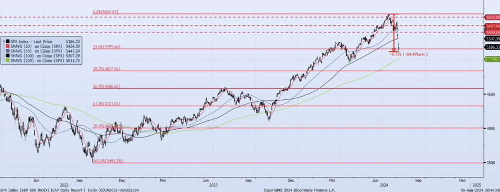 Ironically, after pounding the table with warning signs the past 6 weeks there’s not much to say today. I have not seen a market like this since 2007-09 and I am confident there’s more to come. The SPX has now seen a peak-to-trough drawdown of ~10%. Yesterday’s low of 5119 with confirming momentum/trend indicators keeps the index on track to achieve the remaining downside targets I had set at the 200dma (ref 5011) and 4840 (38.2% Retracement of Oct 2022 low (ref 3491) to Jul 2024 high (5669). As I have stated, my internal momentum/trend model (MOTR) had shifted to Negative back on July 18 and remains so. While aggressive, short-lived rallies should be expected as we work through the current drawdown, I would not be inclined to participate. Risk remains to the downside.