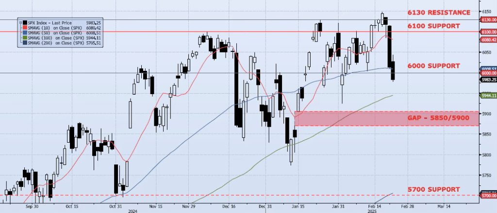 The SPX Index continued its fade yesterday, hitting a low of 5977 and closing down 50bps at 5983. Since achieving an all-time high (ref 6147) and an all-time closing high (ref 6144) on Feb 19, the index has faded and closed below the 6130 support level, the 6100 support level, the 10dma (ref 6080), the 50dma (ref 6008) and the 6000 support level. Additionally, this price action has been confirmed by degrading momentum and trend as my volatility indicators are also confirming “risk off”. The ICAP Momentum/Trend (MOTR) Model signal remains in Negative. As I wrote yesterday, “I am fully convinced that, regardless of any “buy the dip” bounce we may see in the coming days, the much larger trade is to the downside. I will be selling into any SPX strength, watching for the break below 6000 and adding to my long volatility position.”