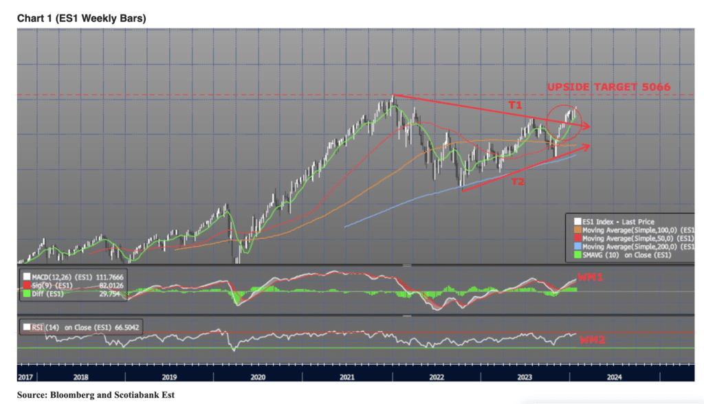 *As I wrote yesterday with reference to the Daily chart, "price has shifted to a bullish stance with confirming internals". As we are close to closing the month of Jan, I thought it would be helpful to once again zoom out and look at the Weekly chart as I do from time to time. The massive, long term trendlines (T1, T2) were clearly converging as the Dec 15 bar broke out to the upside with confirming momentum (WM1, WM2). This sets up for a test of upside resistance at 5066 (Jan 2022 peak). All else equal I see no reason why the index wouldn't achieve, at a minimum, a test of this level.