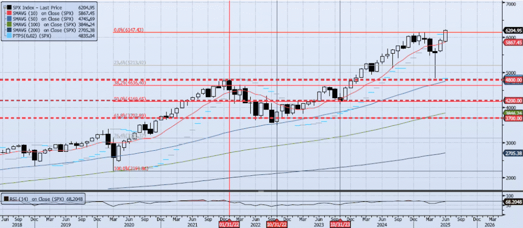 The SPX index gained 52bps again yesterday, closing at a new all-time high of 6204. Momentum and trend indicators are set up well for additional upside. My Spot VIX signal has shifted to “neutral” from a very productive “risk on” signal which triggered back on May 26. My VIX Term Structure signal is “risk on”. The ACAP Momentum/Trend Model signal is Positive. Based on the current set up, the index has room to the upside and seems poised to take it. Risk is skewed to the upside.