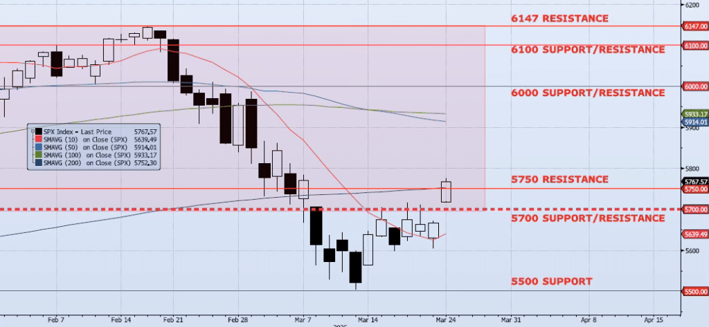 The SPX index gained 1.76% on the day, closing at 5767. This marks a 4.46% rally from the Mar 13 close (ref 5521). The index has now cleared resistance at 5700 and 5750. Additional near-term resistance levels are 5800 and the 50dma (ref 5914). Momentum and trend indicators are improving as the index continues this short-term counter trend rally. Spot VIX closed at 17.48, ~40% below the Mar 11 peak of 29.57. The ICAP Momentum/Trend (MOTR) Model signal has shifted to Positive. While I remain convinced that risk over the intermediate term is skewed to the downside, the Positive MOTR signal suggests that for the near term there is more upside potential. At the moment I do not like the long set up despite the MOTR signal. Therefore, I will not be getting long, nor will I be adding to any shorts until we see a shift back to Negative. To note, the MOTR Model is a rule-based model, not a black box. This allows me to make judgement calls and step away when I feel it is warranted while never trading against the MOTR signal outright. Now is one of those instances.