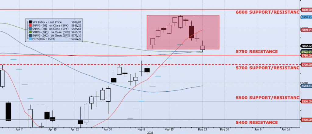 The SPX index fell 67bps during Friday’s session, closing at 5802. The index did hit a low of 5767 early in the session testing both the 200dma (ref 5773) and the 100dma (ref 5766). More importantly, the index broke the 5786 level which I have been focused on. This level represents the May 12 low and support for the May 9 / May 12 gap. This break was on an intra-day basis only, but suggests further weakness is likely in my opinion. The closing print came at an approximate mid-way point between this low and the session high (ref 5829). My momentum and trend indicators have continued to degrade over the past few sessions. My Spot VIX signal is “risk off”. My VIX term structure signal is neutral. The ACAP Momentum/Trend Model signal remains Neutral but is setting up for a potential shift to Negative over the coming days. As I wrote last week, “I continue to see a growing risk of an extended move to the downside with 5786 (May 12 low) as a key level. A break below 5786 should produce an accelerated drawdown, filling the May 9/May 12 gap, and a test of 5700.” Bottom line, this is becoming a very negative set up very quickly.
