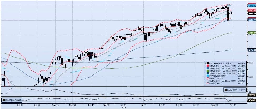 The ES1 Index (Generic 1st Month S&P 500 E-mini) gained 1.51% on the session, closing at 6704. The high on the day (ref 6711) was 2.62% above Friday’s low (ref 6540) and just shy of the Bollinger 20dma (ref 6722). Momentum and trend indicators continued to degrade. My Spot VIX signal shifted to “risk on”. My VIX Term Structure signal remains “neutral”. The ACAP Momentum/Trend Model signal for the ES1 Index remains Negative. The headline driven spike in volatility is settling back down. As I wrote yesterday, “I would say that although the ACAP signal has shifted to Negative, I would wait for a break below the 50dma (ref 6529) to get outright short.” That approach seems to have been correct and is avoiding losses/churn within the portfolio. The 50dma is currently a focus and is ticking at 6602.