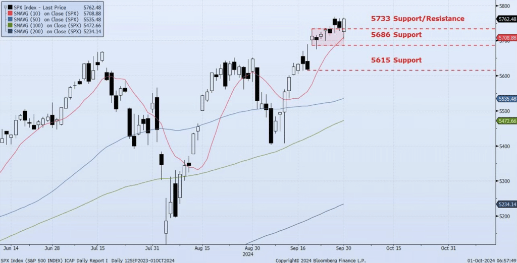 A late session rally pulled the SPX Index off the session low of 5703 to a high of 5765 and a close of 5762. Note the 10dma (ref 5708) held as intraday support. The Index continues to churn around what I see as a significant support/resistance level at 5733 (Sep 19 high). As the Index achieved a fresh closing all-time high, market internals continue to fade/flatline suggesting that there is some minor level of negative divergence developing. The ICAP Momentum/Trend (MOTR) Model remains in Neutral signaling a potential for price reversal and fade from current levels. While waiting for some resolution to the current neutral setup, I do see risk skewed slightly to the downside but am waiting for confirmation from both price and the MOTR signal.