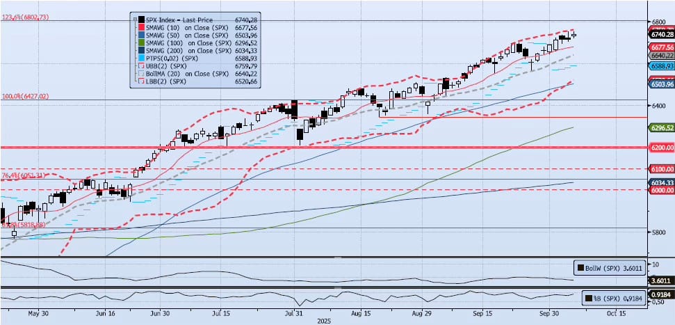 The SPX index gained 36bps during yesterday’s session, marking a new all-time closing high of 6740. To note, on a closing basis the current ACAP signal has returned 3.19%. Momentum and trend indicators improved. My Spot VIX signal remains “neutral”. My VIX Term Structure signal remains “risk on”. The ACAP Momentum/Trend Model signal remains Positive. As I have continued to write, “Risk remains skewed to the upside.” I fully expect the current move to test the next highlighted resistance level at 6802 in the near term.