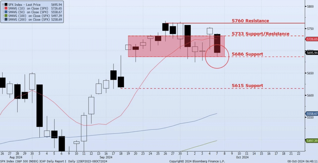 Price action during yesterday’s session for the SPX Index was expected and uniform. The Index was down 96bps on the day, closing at 5695. The 5733 support level which I have remained focused did not hold. The Index then faded the entire Sep 19 high/low range (highlighted on chart) to test previously identified support at 5686 with a low of 5686.85 (almost perfect). Spot VIX spiked almost 20% on the day closing at 22.64. Additionally, VIX Term Structure remains biased towards “risk off” as the slope (Spot VIX to 1st and 2nd month) is now greater than +10%, moving further from Contango and closer to Backwardation. The ICAP Momentum/Trend (MOTR) Model Signal remains Negative (day 4) as internals continue to fade and suggest further downside is likely. As I have stated over the past two weeks, I continue to see risk as skewed to the downside from here. I would remain focused on the 5686 support level. A real break at this price level should create a drawdown to 5600 and 5500 in the near term.