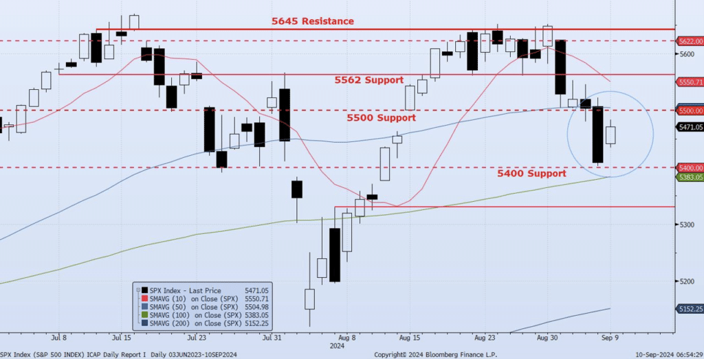 5450: 38.2% Retracement for the recent trough-to-peak move (Aug 5 – Aug 30) (BROKEN)