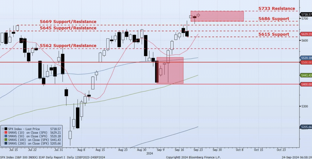 The SPX Index was relatively subdued yesterday, quietly gaining 28bps and achieving an all-time closing high of 5718. Spot VIX remains pressed, closing at 15.89 as Term Structure slides deeper into “risk on” territory. My ICAP Momentum/Trend (MOTR) Model Signal remains Positive for the third day. The current return on a closing basis is a modest 10bps. That said, I remain focused on a potential breakout to the upside through previously identified resistance at 5733 (Sep 19 High). In fact, I wrote yesterday that “The near-term support/resistance range which I am focused on is 5615/5733 (highlighted on chart). A breakout above 5733 with a Positive (confirming) MOTR Signal would be very bullish. There I would add significantly to my long exposure. Ahead of that I am net long, paired down and watching”. As the Index has done some good work within the Sep 19 bar range, I am tightening that support resistance range of focus to 5686/5733 (see chart). Based on recent price action, internals, Spot VIX levels, VIX Term Structure and the Positive MOTR Signal I remain net long but paired down. I am focused on adding to those longs on a breakout above 5733 while remaining conscious of the fact that the Index needs to hold above 5686 to keep the current bullish near-term structure intact.