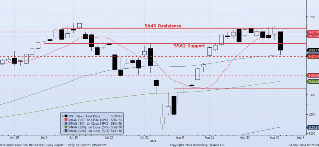 I wrote in my Aug 23 note that my Momentum/Trend (MOTR) Model had shifted from Positive to Neutral on the close on Aug 22. Additionally, over the past 8 sessions I have noted that near term resistance at 5645 was holding as Spot VIX and VIX Term Structure were beginning to show signs of increasing volatility. Prior to yesterday’s 2.12% drawdown I wrote that “Overall, the SPX remains jammed between a near term support/resistance range of 5562/5645. I am watching for either level to break with a confirming MOTR signal. The odds of that being a break to the downside are increasing. I would remain cautious here". Yesterday’s move was exactly what I was talking about as the SPX broke the identified 5562 support level with authority, testing the 50dma almost perfectly at 5504. The VIX ran back above 20 and Term Structure slope has now shifted to greater than +10% (risk off). Now what? While the SPX Index (our indicator) remains Neutral for the eighth day as the MOTR Signal continues to degrade back towards outright Negative (as I have continued to write over the past week). Additionally, in the overnight session the S&P 500 Futures completed a MOTR Signal shift to Negative. I fully expect the SPX Index to follow that pattern during today’s regular session. While I expect to see some churning and additional volatility, I would not expect a bounce back rally from current levels. Risk is to the downside for the near term.