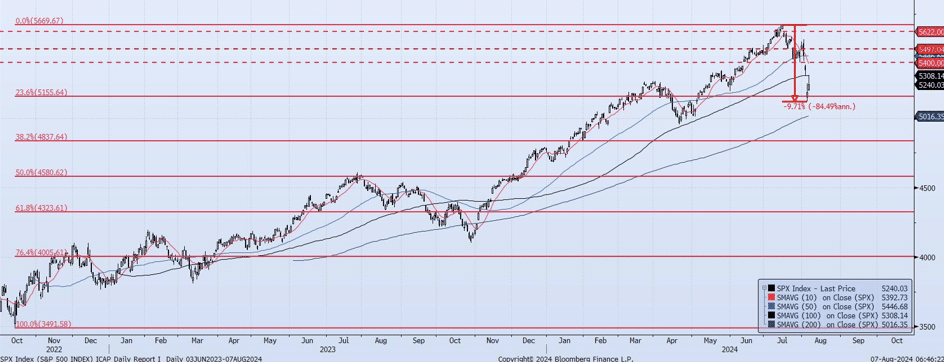 After the recent ~10% peak-to-trough drawdown the SPX index has now achieved all of my previously identified downside targets which were established back in mid-July. Coming off the Aug 5 low of 5119 the index rallied just under 4% to an intra-day high yesterday of 5312. As I wrote in yesterday’s note, “While aggressive, short-lived rallies should be expected as we work through the current drawdown, I would not be inclined to participate. Risk remains to the downside”. Even as the overnight session has the S&P 500 e-mini futures +1.20% as of the writing of this note, I would remain extremely cautious not to get caught “picking up pennies in front of a steamroller”. Market internals are off their recent/worst levels, but the MOTR model remains Negative. The higher risk remains to the downside with targets at the 200dma (ref 5016) and 4840 (38.2% Retracement of Oct 2022 low (ref 3491) to Jul 2024 high (5669)