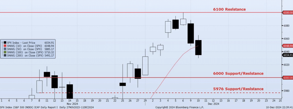 The SPX Index was down 30bps yesterday, closing at 6034. The Index has now had a three-day, peak-to-trough move of -1.15%. Internals have faded and Spot VIX looks poised to spike. The ICAP Momentum/Trend (MOTR) Model signal has shifted to Negative. I continue to believe that there is more room for the Index to fade heading into year end. Risk is skewed to the downside and could potentially accelerate in Q1.