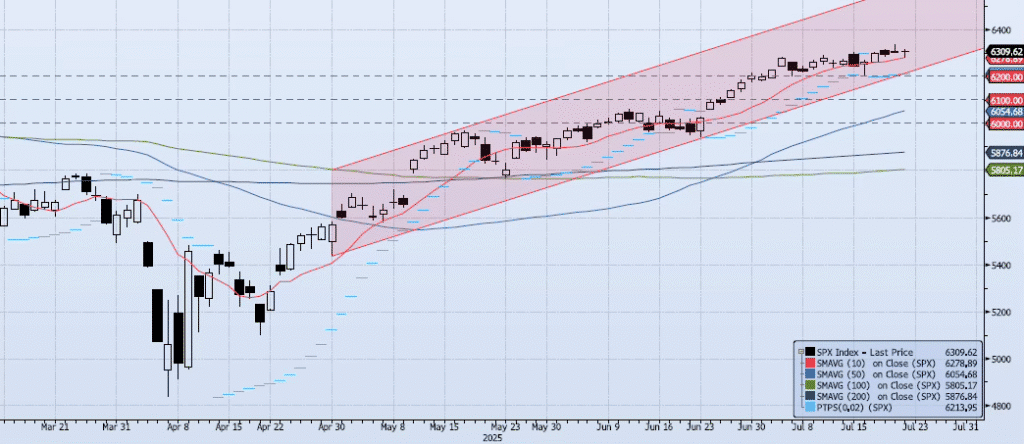 The SPX index gained just 6bps during yesterday’s session, closing well off the low (ref 6281) at 6309. The 10dma (ref 6278) acted as intraday support as my momentum and trend indicators remain negative to flat. My Spot VIX signal is “neutral”. My VIX Term Structure signal is “risk on”. The ACAP Momentum/Trend Model signal is Negative. As I wrote yesterday, “The current setup presents clear negative divergence between momentum/trend and price. I do see the potential for this divergence to resolve to the upside. However, the higher probability trade remains to the downside with a potential test of 6000 well within reason.” All that said, the index is screaming for a reason to test 6400 for the first time in history. I am sticking to the ACAP model and am positioned short here, but I have paired down exposure as this signal is not as clear as I would like.