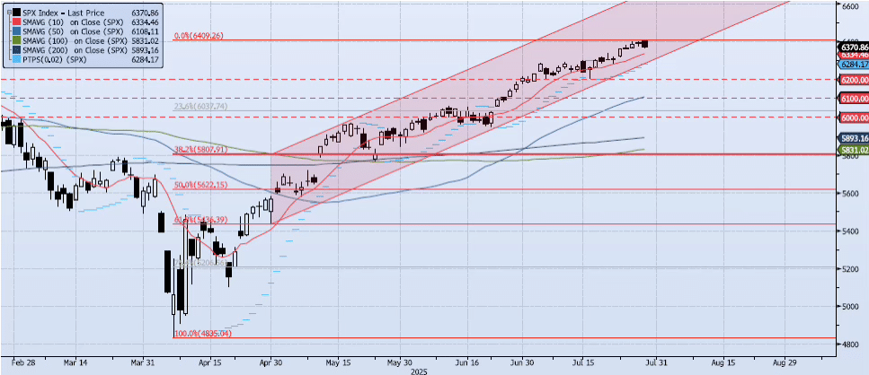 The SPX index lost 30bps during yesterday’s session, closing at 6370. The index hit a new all-time high (ref 6409) very early in the cash session and then struggled for the balance of the day. Yesterday’s high/low/open/close (6409/6363/6405/6370) created a large, negative stick. This large, negative stick when viewed in combination with the previous day’s bar, forms a significant “bearish engulfing pattern”. This pattern, while it needs to be confirmed in the coming days, occurred as my momentum and trend indicators struggled to expand. The ACAP Momentum/Trend Model signal shifted back to Neutral. As I wrote in yesterday’s note, “a breakout above 6400 would set up for a run to 6600. I do see this as the higher probability trade currently.” That said, the index’s current inability to hold above 6400 as internals churn is concerning. This is a true neutral position with upside/downside risk evenly distributed.