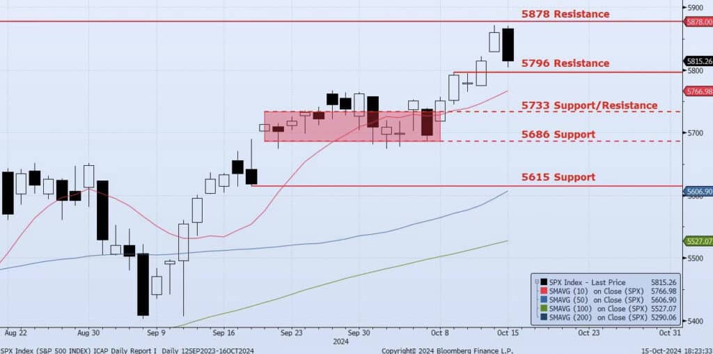 I wrote in yesterday’s note that “the Index seems to have additional upside from current levels. A break above 5878 (resistance) sets up for a potential test of 5970 and 6000. I would think this is the likely path but would expect some retracement over the coming sessions with a potential test of support at 5796/5800”. The SPX Index did in fact test 5800 (as expected) with a low of 5804 and a close down 76bps at 5815. The move down was relatively organized and one directional with Technology taking a rare role as one of the weakest sectors on the day (along with Energy). Spot VIX caught a bid and closed back above 20 at 20.64. I am watching for a close above 22.70 as a potential risk off signal. The ICAP Momentum/Trend (MOTR) Model Signal remains Positive but will shift to Neutral with any follow through to the downside. Overall, I remain net long but the 5800 level needs to hold. A breakdown below with a shift in MOTR could set up for an aggressive pre-election selloff. This scenario seems more possible than most would think as overall positioning is very long and very levered with the election presenting a massive known unknown. Keep your eyes on the screen.
