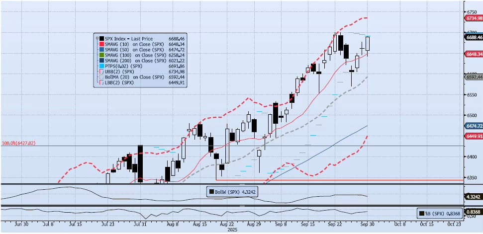 The SPX index gained 41bps during yesterday’s session, closing at 6688 to end both the month and the quarter. This close ticked just 8bps below the Sep 22 all-time high closing price of 6693. Price remains constructive. Momentum and trend indicators held. My Spot VIX signal remains “neutral”. My VIX Term Structure signal remains “risk on”. The ACAP Momentum/Trend Model signal remains Positive. As I have written the past few days, “I would remain long the index above 6600 and reduce exposure on a break below and/or shift in the ACAP signal to Negative.” Risk remains skewed to the upside.
