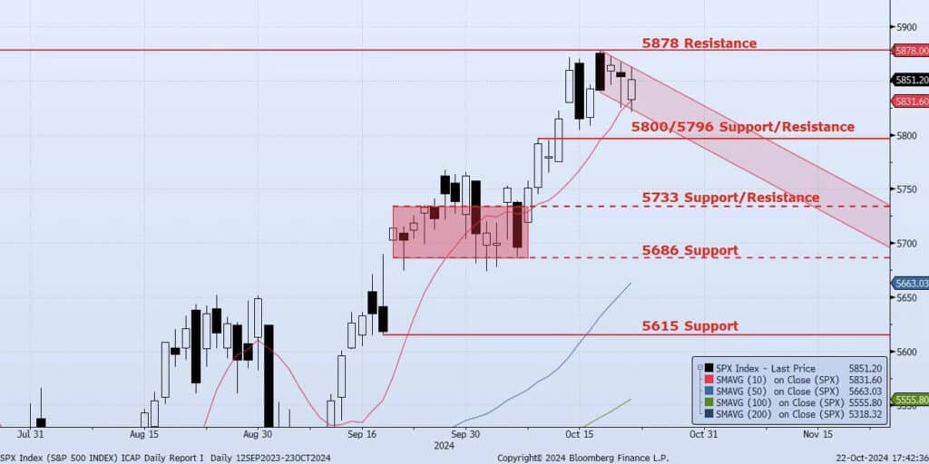 The SPX Index was down just 5bps on the day, closing at 5851. As benign as that seems, the session was a bit more volatile with a wide high/low range of 5863/5821, a break of support at the 10dma (ref 5831) on an intraday basis and a continued inability of the Index to break out above 5878. The ICAP Momentum/Trend (MOTR) Model shifted from Positive to Neutral as internals continue to degrade. I continue to see risk skewed slightly to the downside from current levels and expect a test of support at 5800 in the near term. That said, I would not be surprised if there was a derisking of assets heading into the election which could create a nice trade to the downside over the next two weeks.