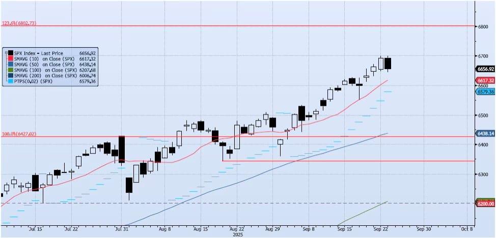 The SPX index lost 55bps during yesterday’s session, closing at 6656 after achieving a minor new all-time high at 6699.52. My momentum and trend indicators remain firm. My Spot VIX signal remains “neutral”. My VIX Term Structure signal remains “risk on”. The ACAP Momentum/Trend Model signal remains Positive. While there was some minor retracement today, I don’t see a significant fade developing yet. The 6600 level could get tested but the current setup would suggest a hold there and rally back towards 6700. Risk remains skewed to the upside for the near term.